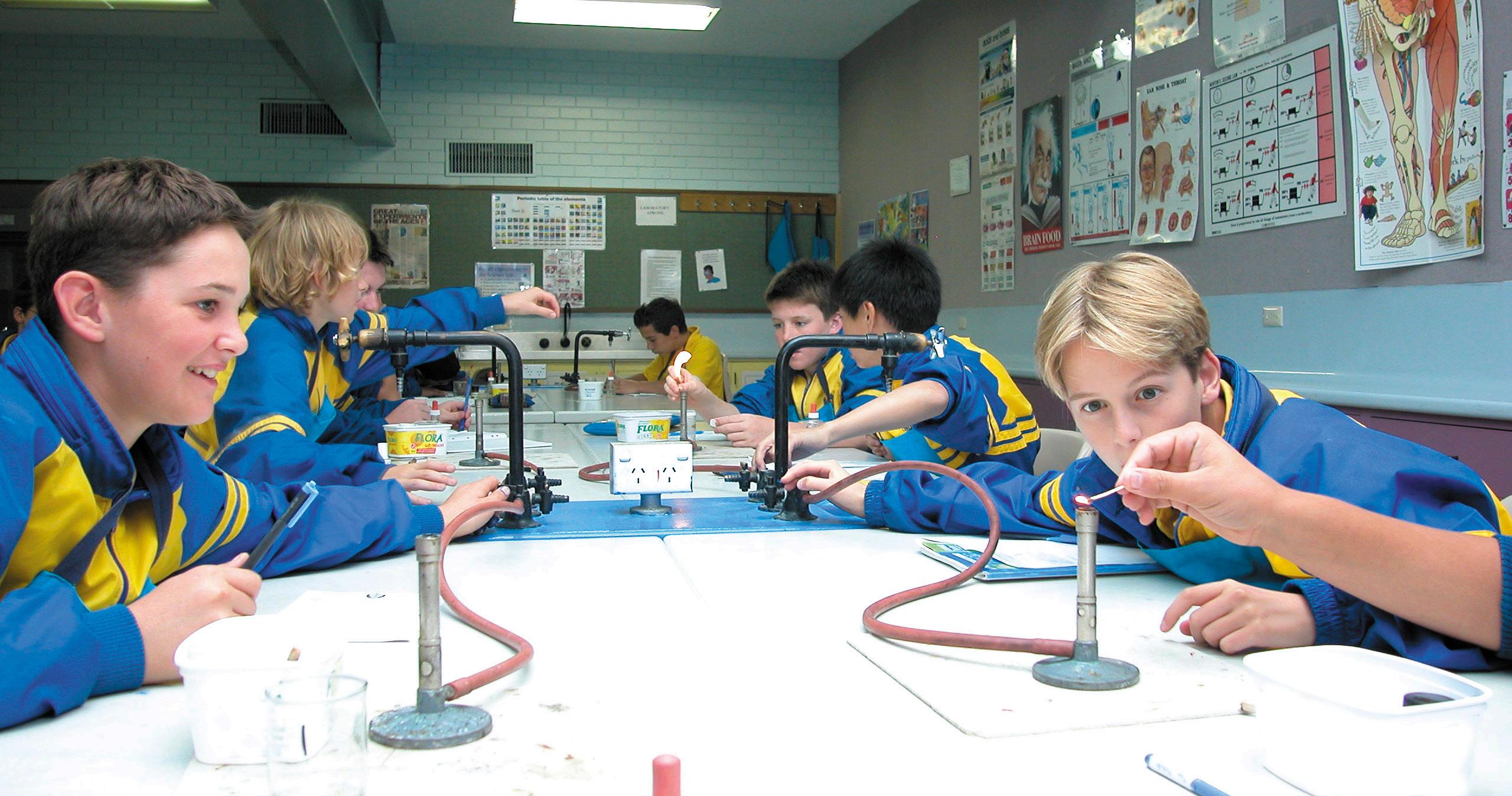 In both the accompanying photo and our magazine cover, you can see Year 8 students with Mr Larry Evans (Old Collegian from 1975) performing the “Flame Colours” test. In this test, students investigate a variety of different compounds to see what colours they emit when they are burnt in the blue flame of the Bunsen burner. As you can imagine, students love this activity — the chance to burn anything is always popular!