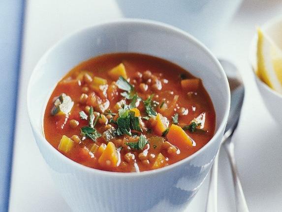 Step 2: Pour the soup into a warmed bowl and top with vine roasted vine tomatoes.