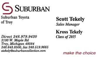 62 Jim Elder III Greg “JR” Peterson ‘95 General Manager New Car Sales Manager www.saveoncars.net Direct: 586-977-6316 www.saveoncars.net gpeterson@suburbancollection.com 40333 Van Dyke Avenue Sterling Heights, MI 48313 586.268.7500