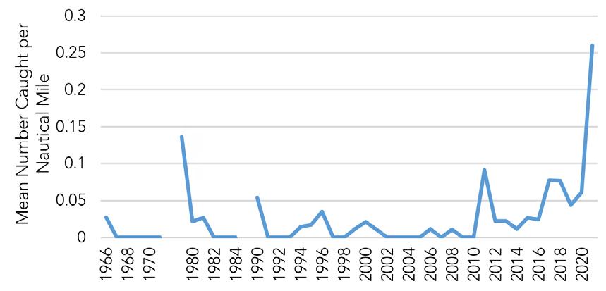 The index of eel relative abundance is developed from 13 trawl survey stations in the lower Delaware River by the Delaware Division of Fish and Wildlife Juvenile Finfish Trawl Survey. The net is a 16-ft (4.8m) semi-balloon trawl with a 0.5-in (1.3-cm) cod end liner towed by 62-ft (19-m) R/V First State. The geometric mean catch-per-tow, using catch data collected from April through June from 1982-2021, is used to estimate an index of abundance (Fig 7.2.6.4). Catch typically consists of eels from ages 0 to 7, with 3 years of age representing the most frequent age observed in the catch (DDFW unpublished data). All eels captured in this survey are yellow-phase.