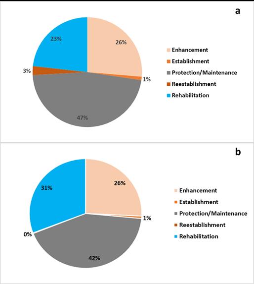 Figure 8.5 Proportions of the total habitat area (acres) either protected or restored (i.e., enhancement, establishment, reestablishment, and rehabilitation) 2006-2021 (a) and 2017-2021 (b) period since the last TREB as reported in NEPORT.