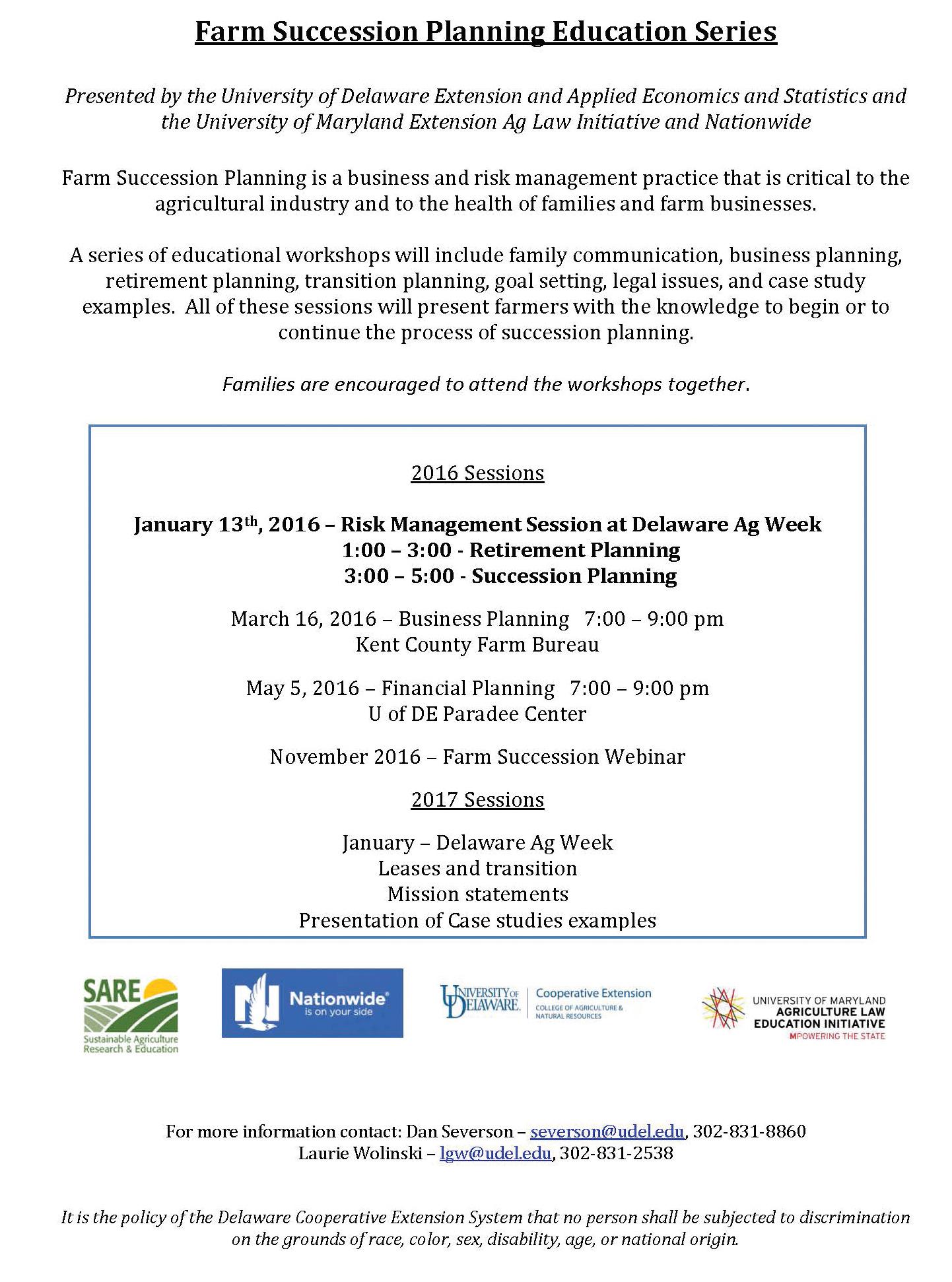 Future sessions for the Succession Plan ning Education Se ries include Business Planning on March 16, 2016 from 7:009:00 p.m. at the Farm Bureau Office; Fi nancial Planning on May 5, 2016 from 7:00- 9:00 p.m. at University of Dela ware’s Paradee Cen ter in Dover; and a Farm Succession Webinar planned for November 2016. A presentation of case studies examples will take place at the 2017 Delaware Ag Week.