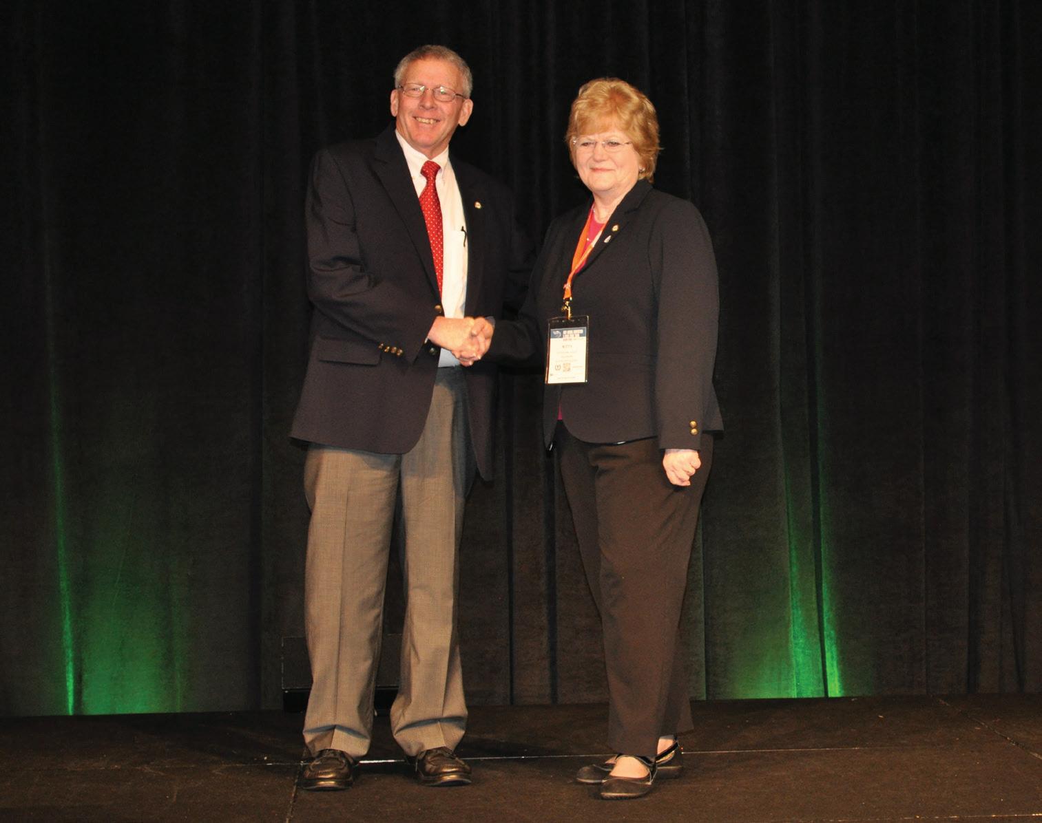 DFB President Kitty Holtz shakes hands with Former AFBF Vice President Barry Bushue after accepting awards at the Foundation’s Night Out.