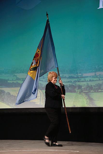 DFB President Kitty Holtz walks the flag across the stage during the Opening Session of the AFBF Convention.