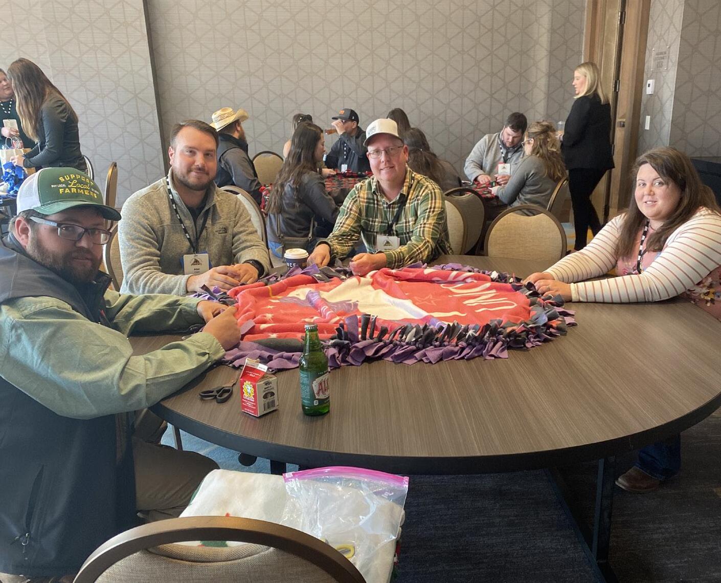 YF&R State Vice Chair J.T. Robbins, NCC Chair Abel Elwell, Kent County Chair Michael Lynch and State Chair Mollie Lynch volunteer during the convention making blankets for the homeless in Louisville.