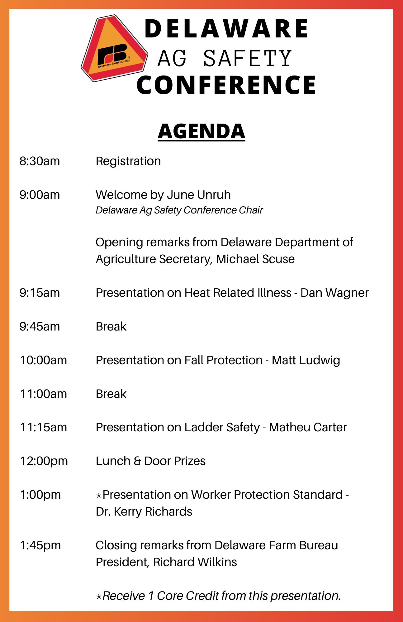 The conference, offered in partnership with Nationwide, the University of Delaware's Cooperative Extension and Delaware's Department of Agriculture (DDA), will feature presentations on health and safety issues, a core credit, free coffee, donuts and lunch for participants, and door prizes.