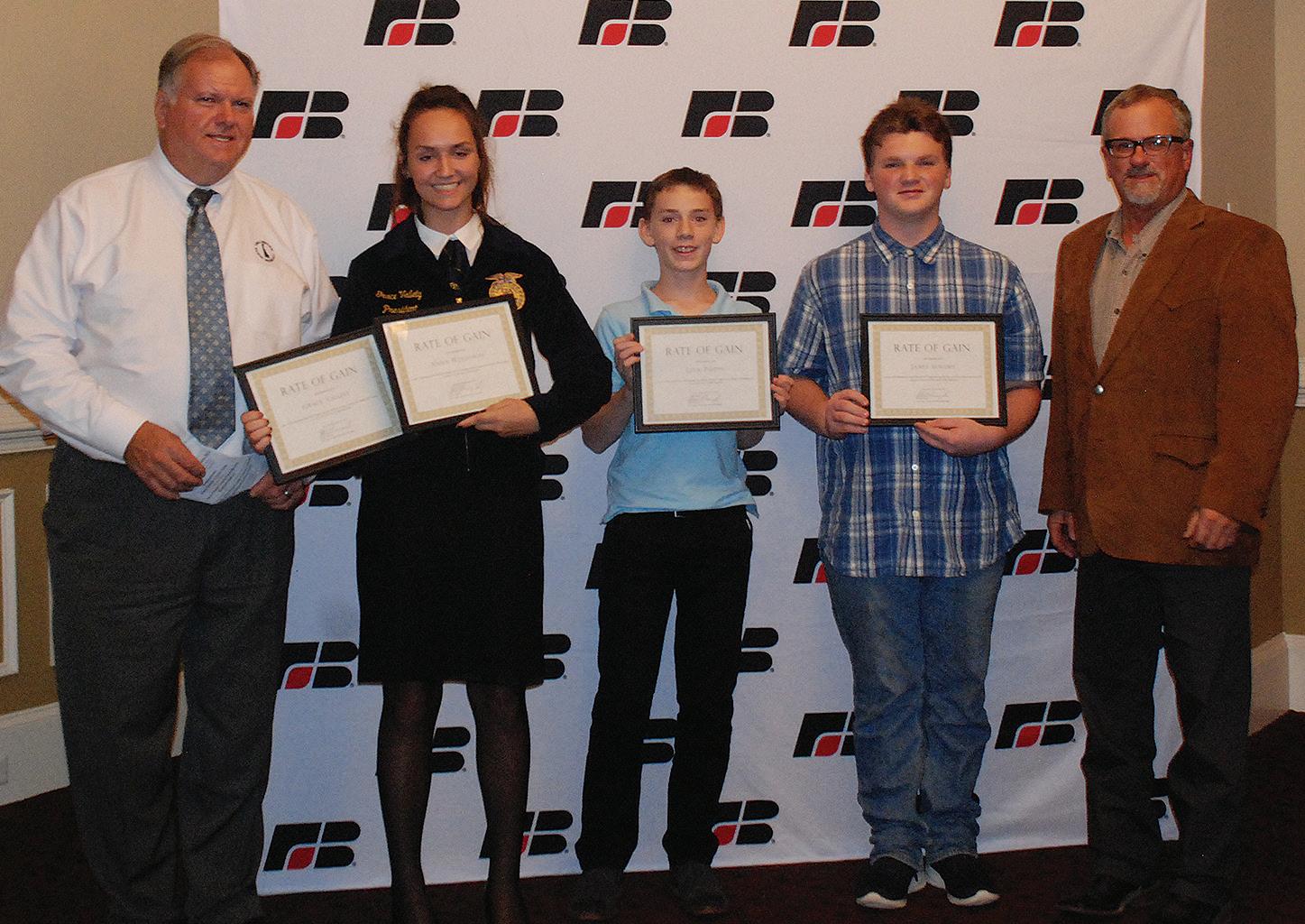 Stewart Ramsey, left, and William Powers Jr., right, presented Rate of Gain certificates to winning young livestock showmen: from left, Grace Vallely, Liam Phipps and James Steward. Anna Holloway was unable to attend.