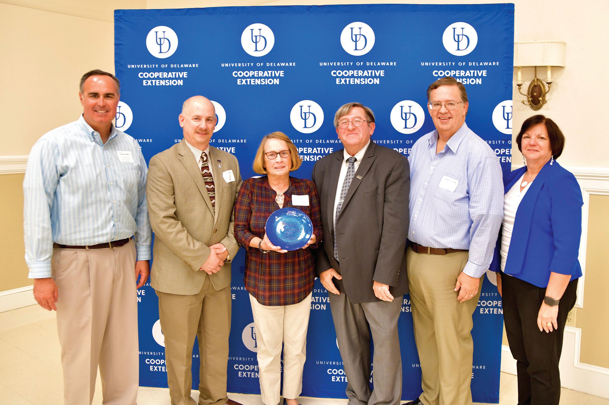 Ernie Lopez (far left), Doug Crouse (second from right) and Michelle Rodgers (far right) present a Friends of Extension award to Joseph Poppiti, Laura Hill and Richard Wilkins of Delaware Farm Bureau.