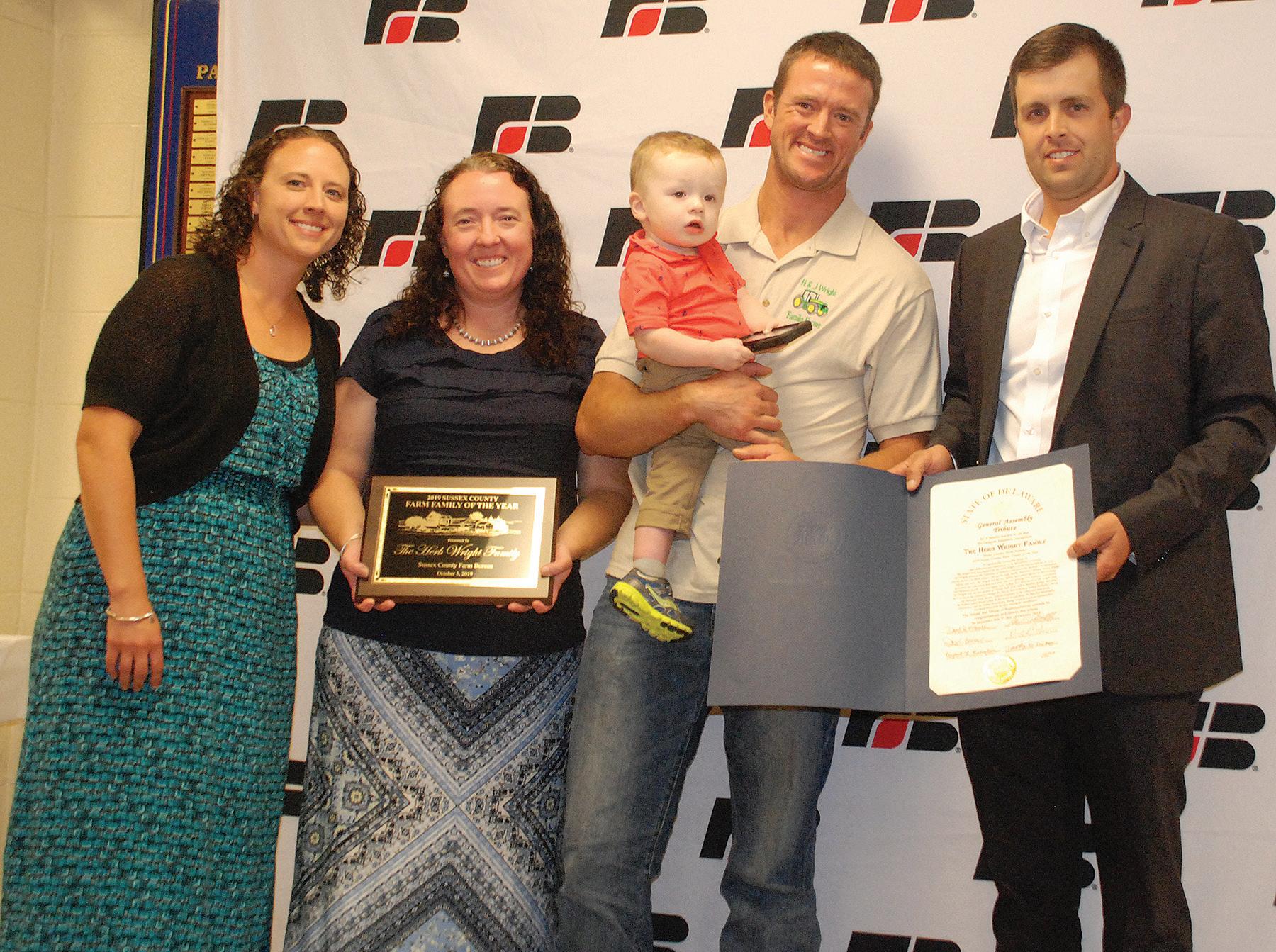 Accepting the Sussex County Farm Bureau’s 2019 Farm Family of the Year Award on behalf of their parents are, from left, daughters, Lisa Littleton and Dawn Brewington, and son, Jeff Wright, holding his son, Calvin Wright. State Rep. Jesse Vanderwende, right, presented a tribute from the General Assembly. Herb Wright and his wife, Kathy, were delayed in returning from a trip abroad and missed the banquet.