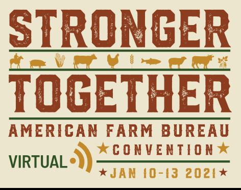 Registration for the 2021 American Farm Bureau Virtual Convention will open later this year and will be free to all attendees. Further details on the event can be found at fb.org/events.