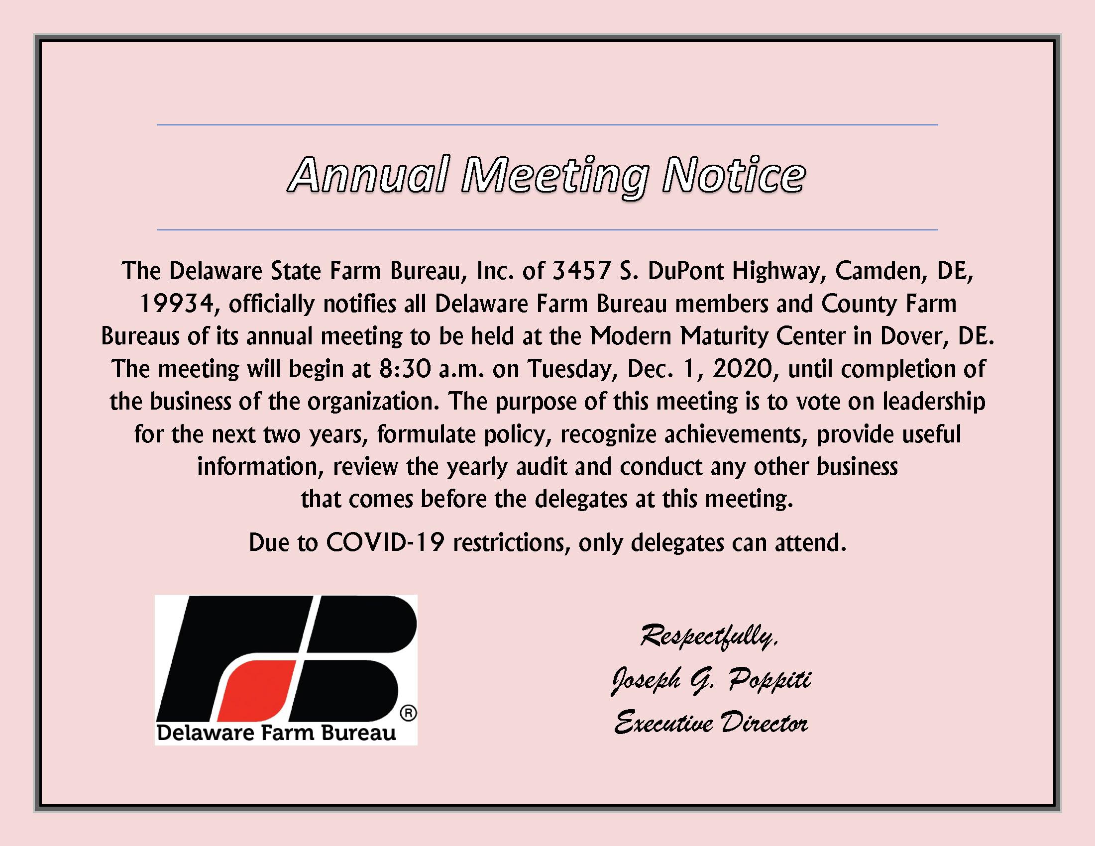 We are also preparing our annual meeting to be held in-person at the Modern Maturity Center in Dover Tuesday, Dec. 1. Due to COVID-19 restrictions, only Farm Bureau leadership and delegates will be able to attend. As always, however, we will bring you all of the exciting news in our newsletters, on our Website and in the next issue of the Delaware Farm Bureau News.