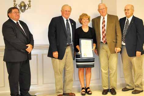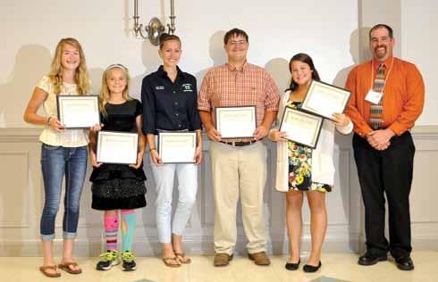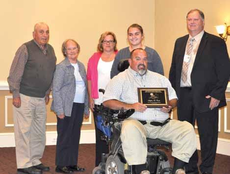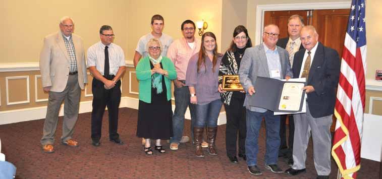 Senator Bruce Ennis, right, and NCCFB President Stewart Ramsey, behind Ennis congratulate the 2015 New Castle County Farm Bureau Farm Family of the Year, the Powers Family. From left are: George Case (Bill’s stepfather); Joe Powers Sr. (Bill’s brother); employee Tyler Fox; Karol Power-Case; Will Powers and his girlfriend, Ariel Bilbrough; and Joan and Bill Powers.