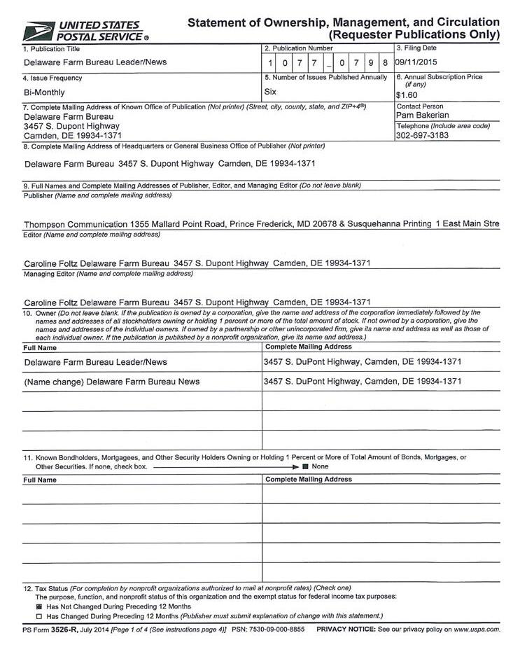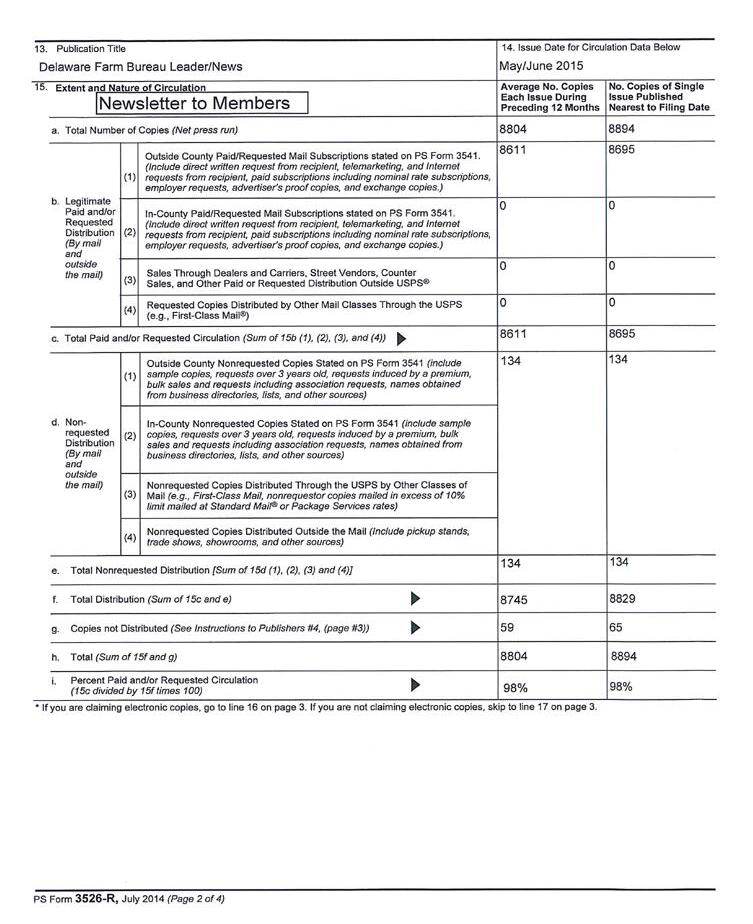 Farm Bureau Leader (ISSN 1077-0798), published in Camden, DE, bimonthly, by Delaware Farm Bureau. Production by Susquehanna Printing. Periodicals postage paid at Camden, DE and additional offices.