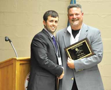 Sussex County Farm Bureau President Jesse Vanderwende congratulates the Sussex County Distinguished Service to Agriculture recipient Mark Isaacs