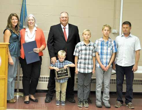 The Clark Family receives a signed tribute from Senator Dave Lawson after being awarded the 2015 Kent County Farm Bureau Farm Family of the Year. Shown left to right are: Bruce Clark I, Patricia Clark, Senator Dave Lawson, Bruce Clark III, Christa Clark and Bruce Clark II.