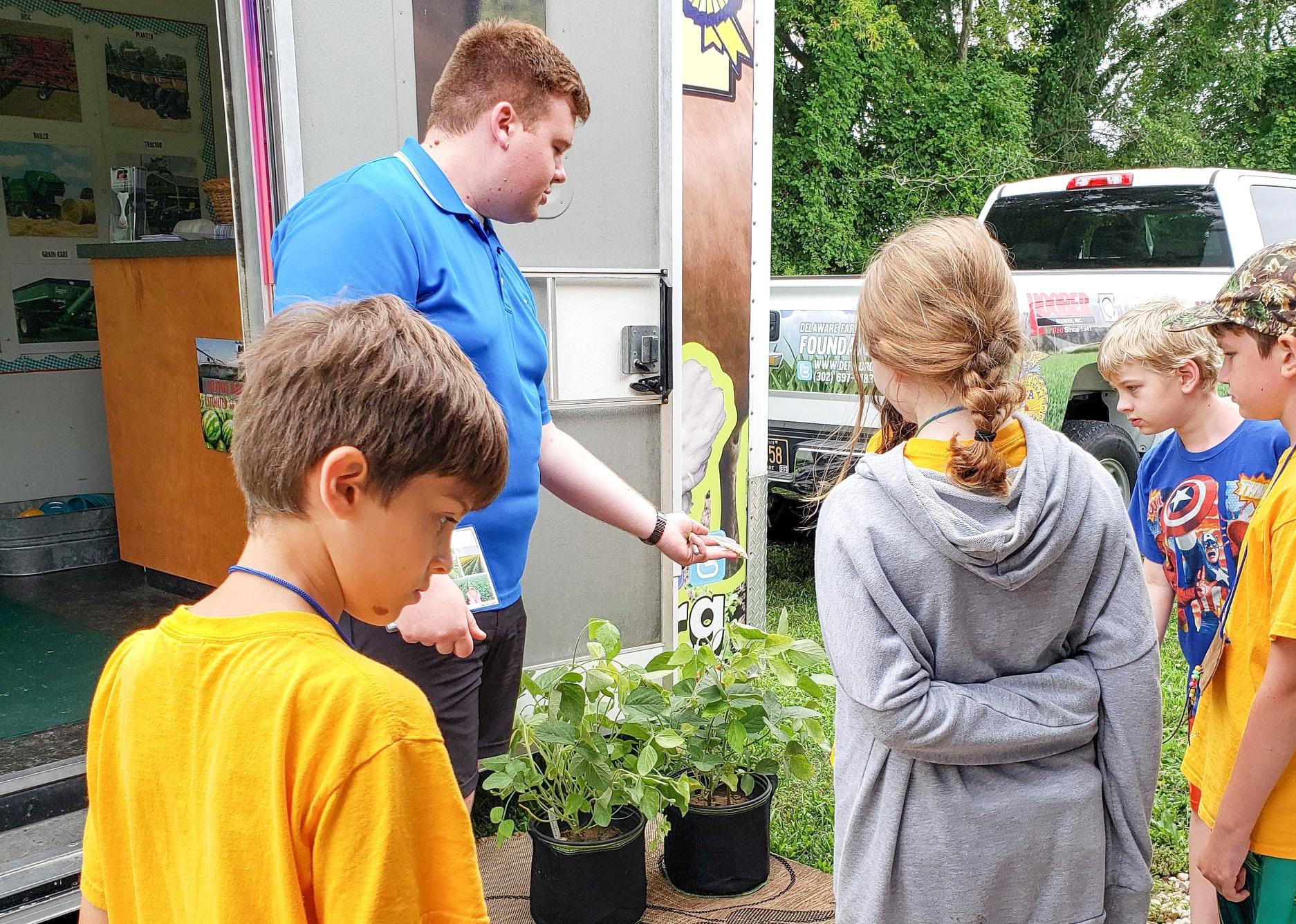 To the left, Intern Kyle Spillane teaches children about agriculture during a summertime ag lab visit.