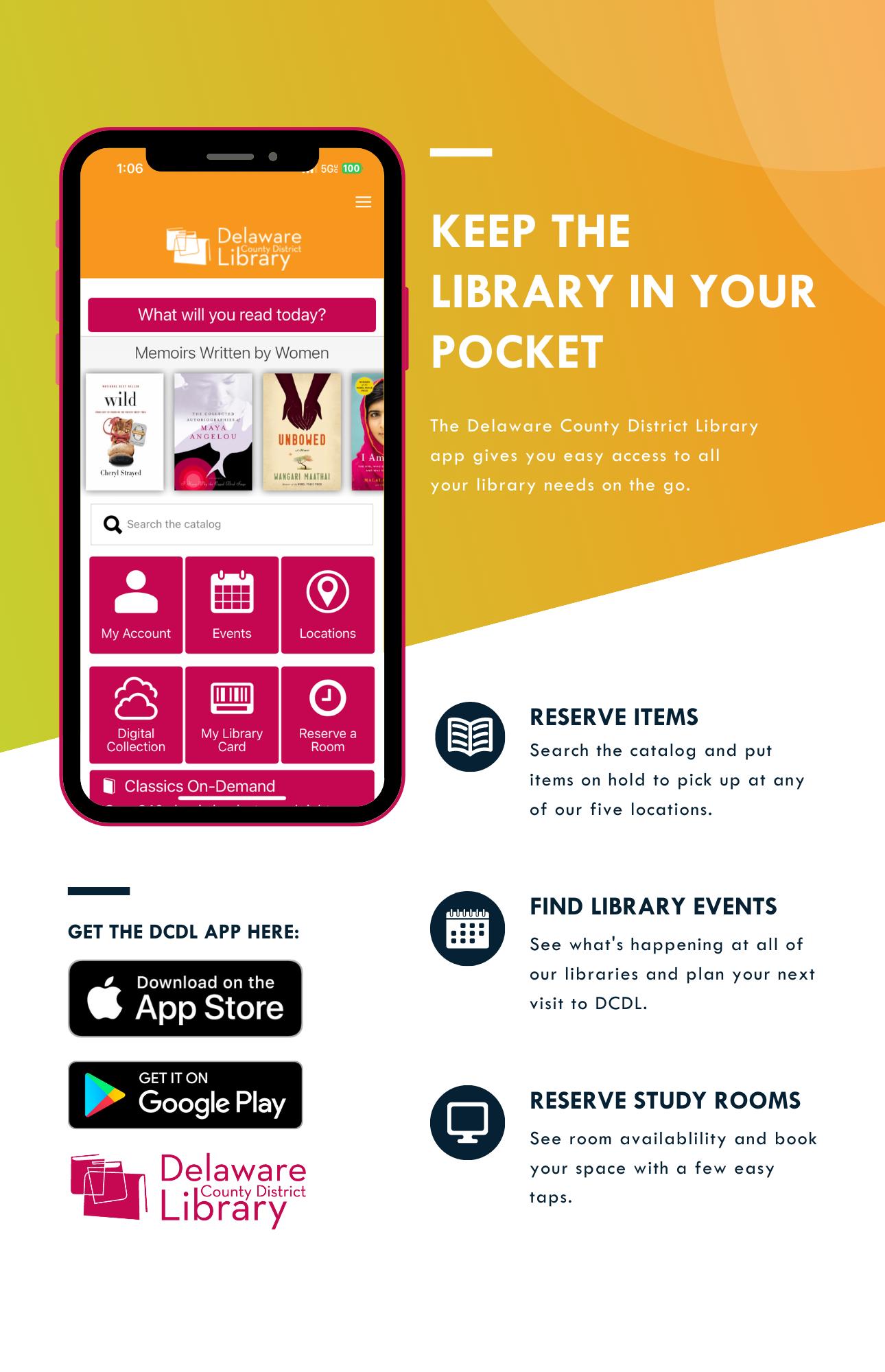 Access the Delaware County District Library with the tap of a finger. Explore recent releases, search the catalog, check your account, reserve a study space, find out about upcoming events, and check branch locations and hours. With easy access to digital collections and easy renewals, it’s your library at your fingertips.