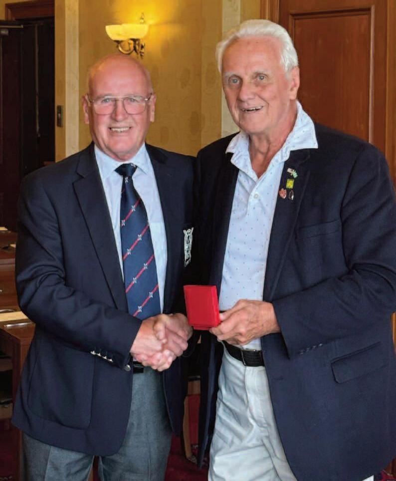 On October 18, 2025, Bob Farrell ’64 received a pin from Thomas Gallagher, Captain of the St Andrews Golf Club, signifying Bob’s 50 years as a member of the club and lifetime member status. The pin includes the club crest and the date of Bob’s acceptance as a member, May 25, 1974. The Old Course at St. Andrews, also known as the Old Lady or the Grand Old Lady, is considered by many to be the home of golf because the sport was first played at St. Andrews in the early 15th century. During Bob’s ny visits to Scotland he has played er 100 rounds of golf, likely 50 of em at St. Andrews, and altogether has ed off at 41 courses throughout cotland. Bob has a fascinating story to ell about his long relationship with the t Andrews Golf Club Stay tuned for more in the spring issue of Delbarton