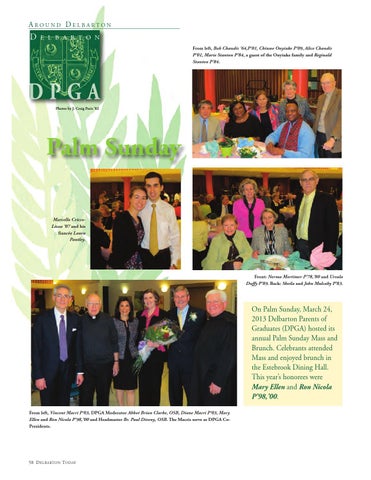 On Palm Sunday, March 24, 2013 Delbarton Parents of Graduates (DPGA) hosted its annual Palm Sunday Mass and Brunch. Celebrants attended Mass and enjoyed brunch in the Estebrook Dining Hall. This year’s honorees were Mary Ellen and Ron Nicola P’98,’00. From left, Vincent Macri P’03, DPGA Moderator Abbot Brian Clarke, OSB, Diane Macri P’03, Mary Ellen and Ron Nicola P’98,’00 and Headmaster Br. Paul Diveny, OSB. The Macris serve as DPGA CoPresidents.