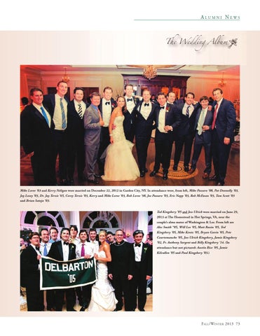 Mike Loree ’03 and Kerry Neligan were married on December 22, 2012 in Garden City, NY. In attendance were, from left, Mike Passaro ’08, Pat Donnelly ’03, Jay Losey ’03, Dr. Jay Terzis ’65, Corey Terzis ’03, Kerry and Mike Loree ’03, Bob Loree ’98, Joe Passaro ’03, Eric Napp ’03, Rob McEwan ’03, Tom Scott ’03 and Brian Sateja ’03. Ted Kingsbery ’05 and Jess Ulrich were married on June 29, 2013 at The Homestead in Hot Springs, VA, near the couple’s alma mater of Washington & Lee. From left are Alec Smith ’’05, Will Lee ’05, Matt Bazin ’05, Ted Kingsbery ’05, Mike Kentz ’05, Bryan Gavin ’05, Pete Courtemanche ’05, Jess Ulrich Kingsbery, Jamie Kingsbery ’02, Fr. Anthony Sargent and Billy Kingsbery ’14. (In attendance but not pictured: Austin Rice ’05, Jamie Kilcullen ’05 and Paul Kingsbery ’03.)