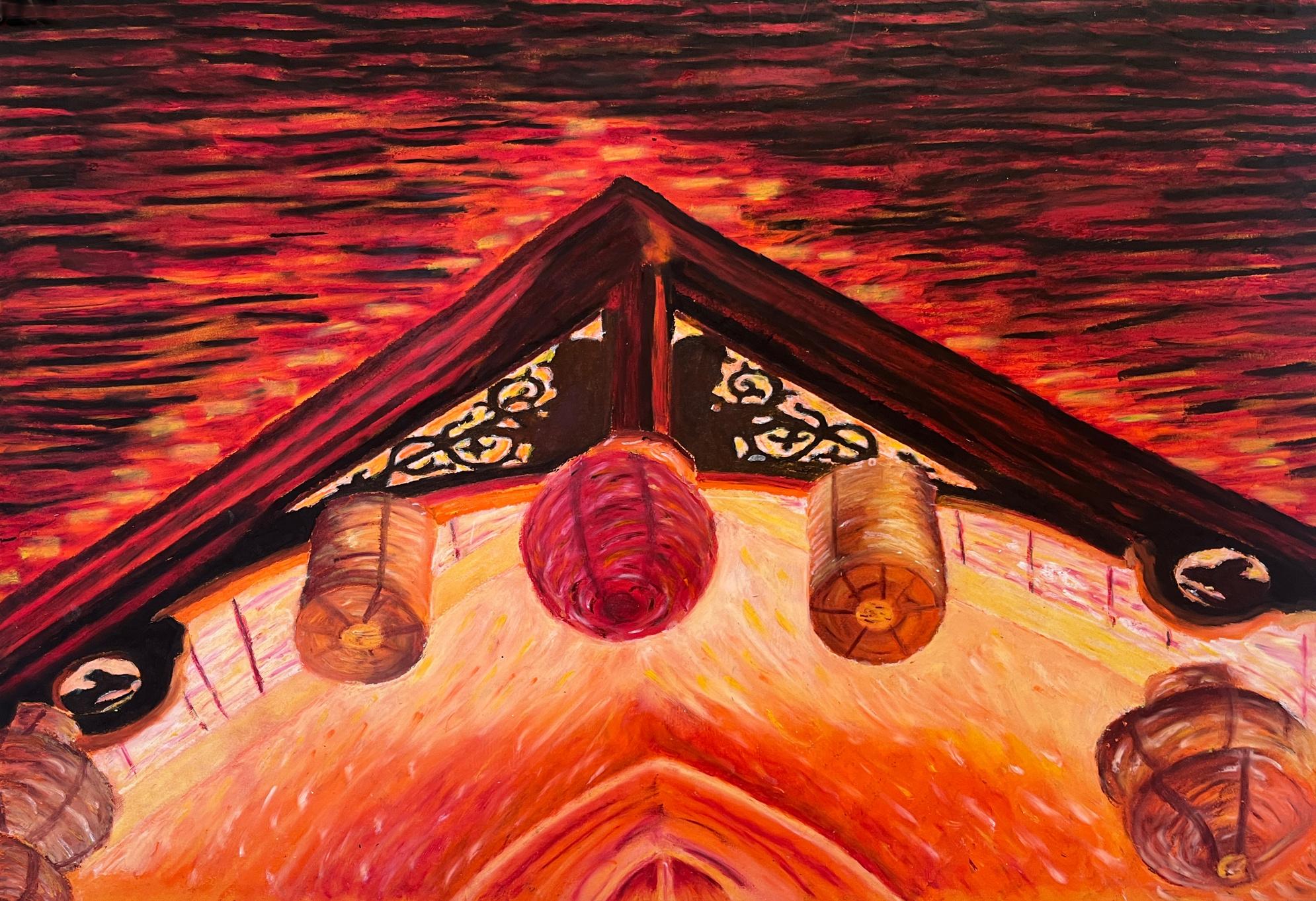 A small solitary boat sits on the rough endless plain. The waves bobbing it up and down like a toy.