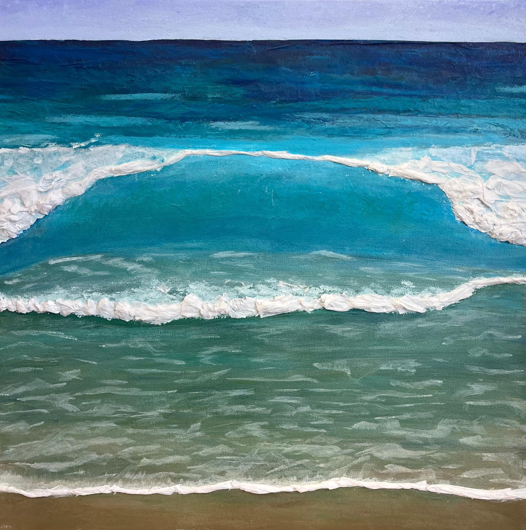 The green water ripples white at the peak as the wave barrels forward, closer to the shore.