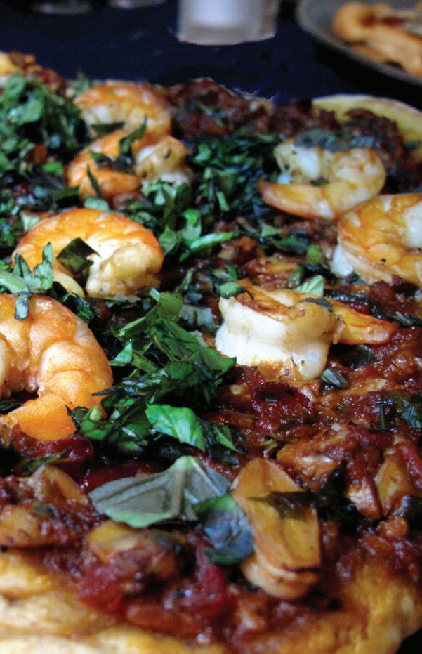 4. Meanwhile, brush or mist the top of the pizza crust with the remaining 1 Tbsp. oil. Sprinkle about half of the mozzarella cheese evenly over the top of the pizza, leaving a 1-inch border. Then evenly spread the tomato mixture on top of the cheese. Add the shrimp in an even layer, and then cover with the remaining mozzarella.