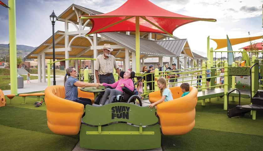user Sway Fun, allowing children using a mobility device to be in the thick of the action. Kids can find stimulation on the spinners, We-saw, and swings, or find quiet places to self-regulate. Everyone