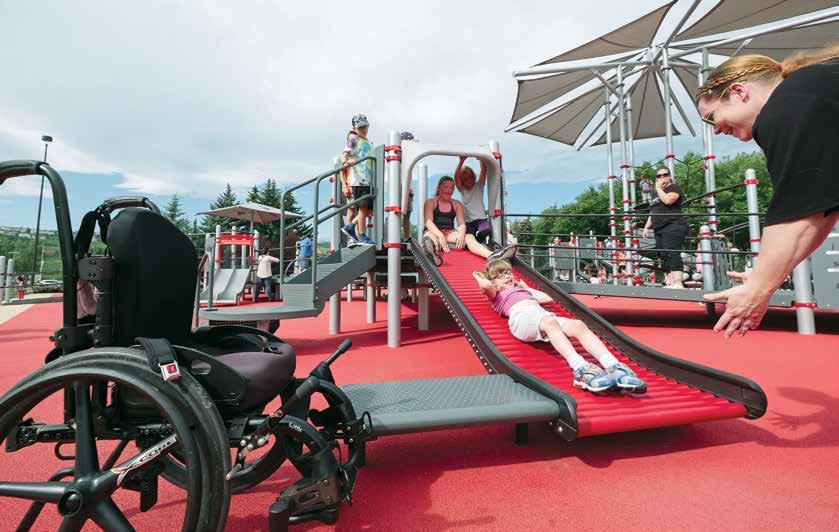 True inclusion can be found in projects like the Canadian Tire Jumpstart Playgrounds at Shouldice Park in Calgary and Clareview Park near Edmonton. Pour-in-place rubber surfacing throughout the play space means that kids and adults who use mobility devices can access all play elements. Ramps with play panels lead to slides, climbers, and the multi-