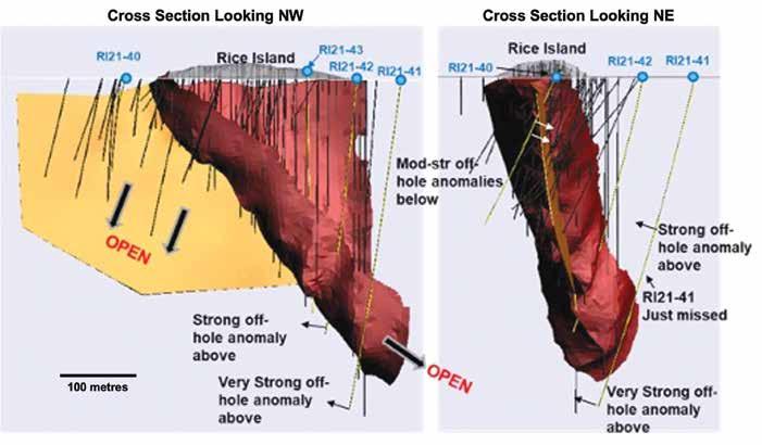 The Rice Island magmatic Ni-Cu-Co deposit was initially explored by Inco Ltd. between 1948 and 1996 with Wolfden completing drill programs from 2015 to 2021. The 2021 drill program was funded in part with the support of a $230,000 grant from the Manitoba Government Mineral Development Fund. This work delineated a U-shaped keel and feeder style Ni-Cu-Co deposit over a strike length of 340 metres that plunges steeply to a current vertical depth of approximately 500 metres where it remains open below. The Keel Zone comprises of massive to semi-massive to blebby style pyrrhotite, pentlandite and chalcopyrite that forms a keel along the base of a plunging gabbroic intrusion hosted in sediments. Prominent intercepts include 10.3 metres of 2.63 per cent Ni, 0.98 per cent Cu, 10.1 metres of 2.39 per cent Ni, 1.24 per cent Cu, 5.2 metres of 4.31 per cent Ni, 1.28 per cent Cu and 6.0 metres of 3.20 per cent Ni, 1.23 per cent Cu.