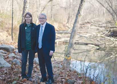 State of Ohio Governor Mike DeWine and Ohio University employee and Raccoon Creek Watershed Coordinator Amy Mackey on the banks of Raccoon Creek after Scenic River Designation.