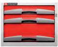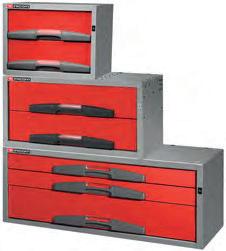 Lades zijn 100% te openen en kunnen eenvoudig onderling verwisseld worden (om bijv. de diepere lade bovenaan te hebben). Statische belasting 900 kg. Wieldiameter 125 mm. Rood: RAL3020 en zwart: RAL9005.