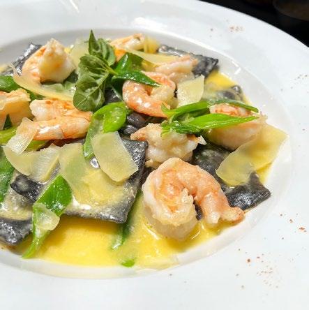 Raviolis caseros hechos con tinta de calamar, rellenos de jaiba acompañdos con exquisita salsa de camarones.