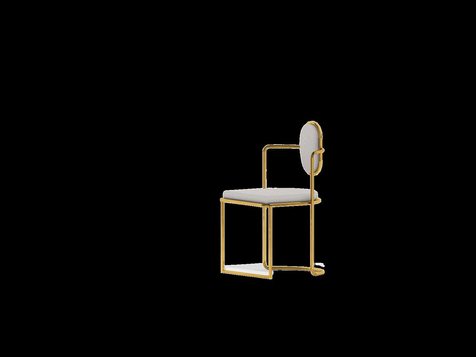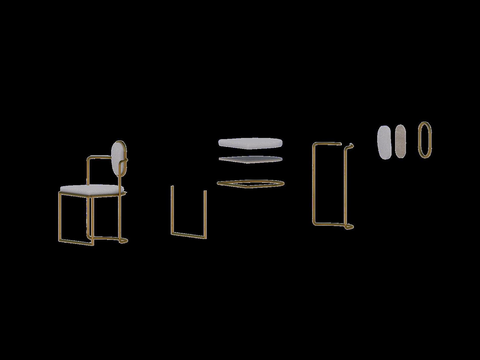 Para la construcción de esta silla se tomaron las varillas de hierro, y se cortaron a medida, luego se doblaron con una dobladora y se soldaron las partes. Luego se pinto con un esmalte símil oro A su vez se mandaron a cortar la base del respaldo y del asiento en madera Y por ultimo se tapizaron en pana, y se unieron a la estructura.