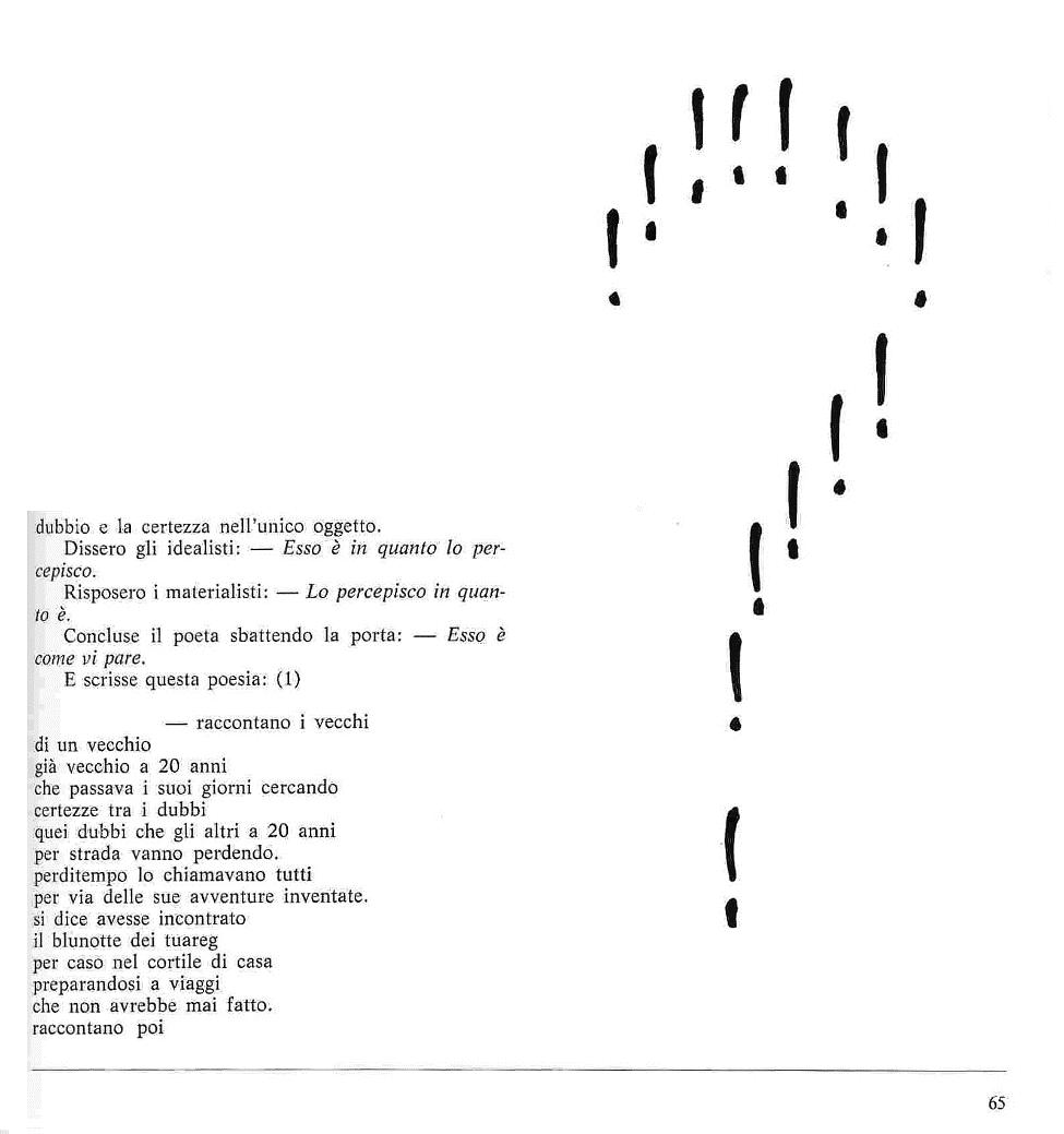 l’unica certezza in me è il dubbio1 fu sul finire degli anni ’50 che lasciai il vecchio punto interrogativo2 (in seconda di copertina la sua origine) imparato sui banchi di scuola. incontrai allora quello rivolto prima a sé stessi che agli altri. in alcuni miei vecchi appunti ho trovato scritto punto dubitativo. non so se questa sia una mia definizione o di altri (invecchiando s’impara che è bene mettere i puntini sulle i3). di sicuro nei miei lavori ha spesso questa funzione. credo che pagina dopo pagina venga precisato quanto intendo dire. in fondo a un cassetto, dentro una cartellina dimenticata a volte ci si può ritrovare. non so dire se sia una fortuna. so che inaspettatamente ci si può trovare davanti a qualcosa di dimenticato. appunto. un pezzo della nostra vita. questo vale soprattutto per chi è disordinato. io lo sono. e nei noiosi giorni di questo ferragosto 2017, mi è tornato tra le mani gran parte del materiale che avevo creato negli anni ’60. utilizzato prima per una pubblicazione e poi, rivisto, per creare eventi espositivi. ho deciso, così, di ripercorrere il sottile e costante legame che mi lega al punto interrogativo. di qui l’idea di raccontarne la storia. o meglio la storia tra me e i segni di interpunzione. come sempre mi succede il discorso mi si è poi allargato. di qui le tante note su di loro anche perché utilizzati nella stesura dei vari testi. sono poi convito che spesso ci si limiti a osservare ciò che appare senza