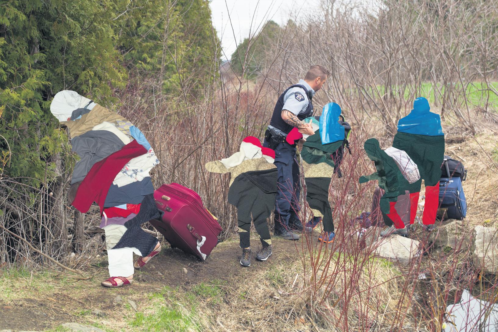 frontière canado-américaine, le célèbre chemin Roxham. Ce lieu, fermé defaçondéfinitiveàlasuited’uneentente entre Ottawa et Washington sous le gouvernement Trudeau en mars2023,étaitautrefoisunpointde passageimportantpourdenombreux migrants.Danscetteœuvre,Huneault recouvre les silhouettes de tissus superposés, voilant volontairement leurs identités et accentuant le