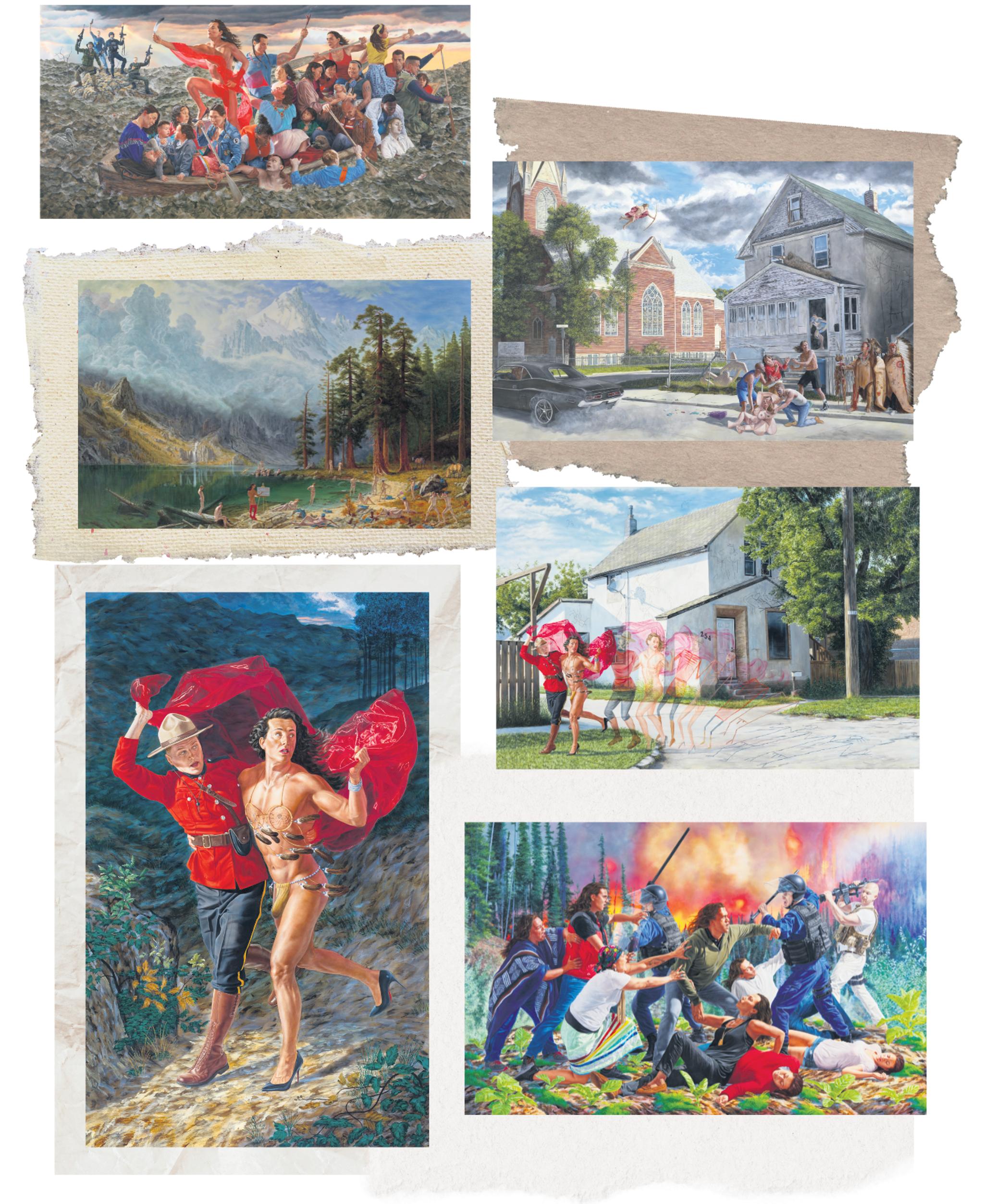 Perché sur ses Louboutins, le personnage bouleverse les codes de la peinture d’histoire européenne en y insérant des références contemporaines. Son caractère anachronique, empreint d’ironie et de provocation, incarne la résilience autochtone à travers les époques et nous rappelle que déconstruire l’histoire officielle est un processus continu – une responsabilité commune, un dialogue auquel l’audience est elle aussi conviée. Dans Le chant d’adieu (2024), le regard perçant des enfants d’un pensionnat en Saskatchewan, obligés d’assister à la pendaison de huit hommes cris et