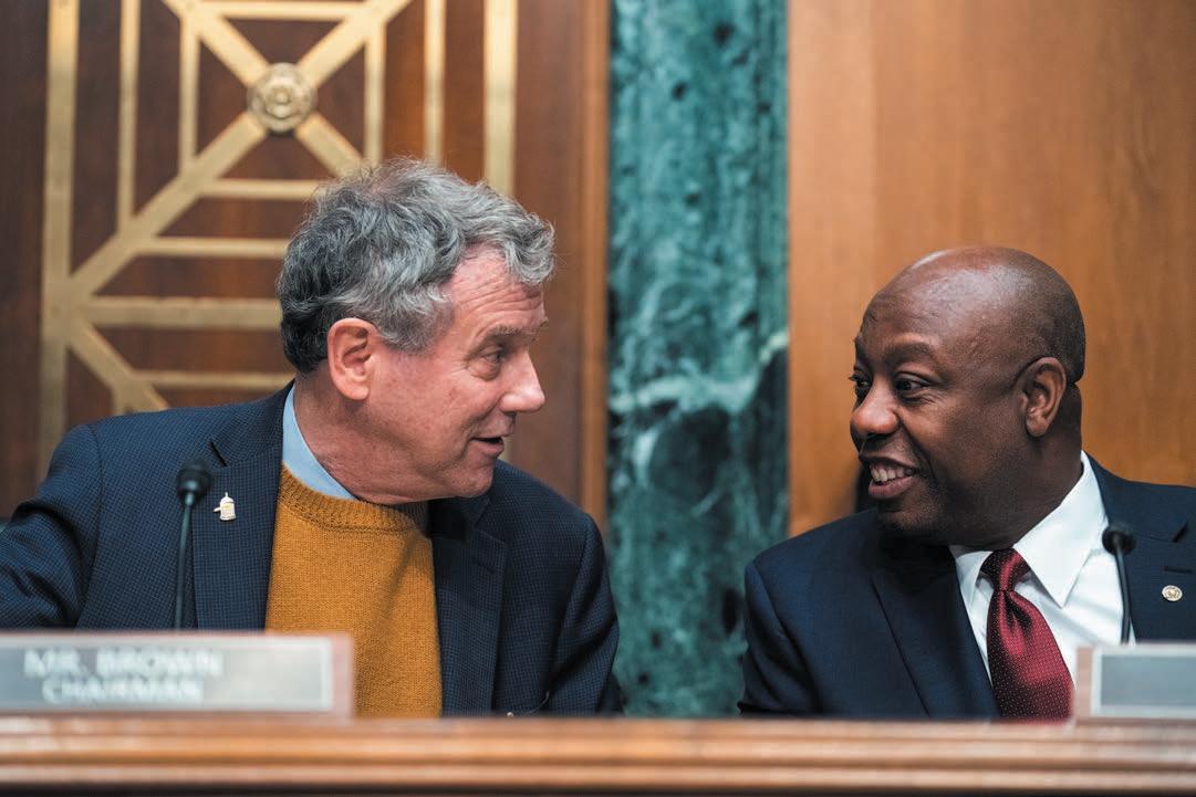 Chairman Sherrod Brown, D-Ohio, and ranking member, Republican Tim Scott, R-S.C., attend the Senate Banking, Housing, and Urban Affairs Committee hearing titled “Stopping the Flow of Fentanyl: Public Awareness and Legislative Solutions,” in Dirksen Building on Thursday, January 11, 2024.