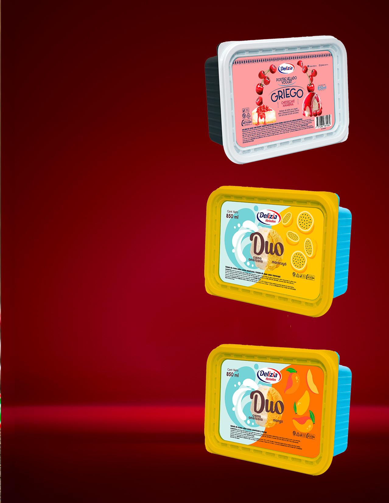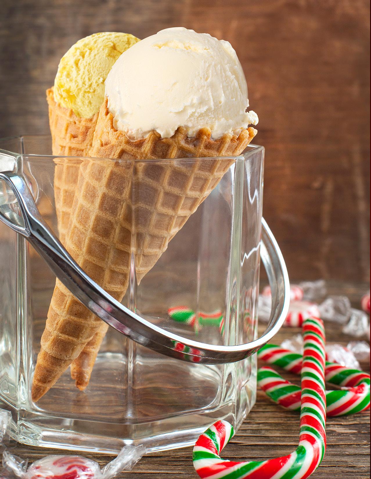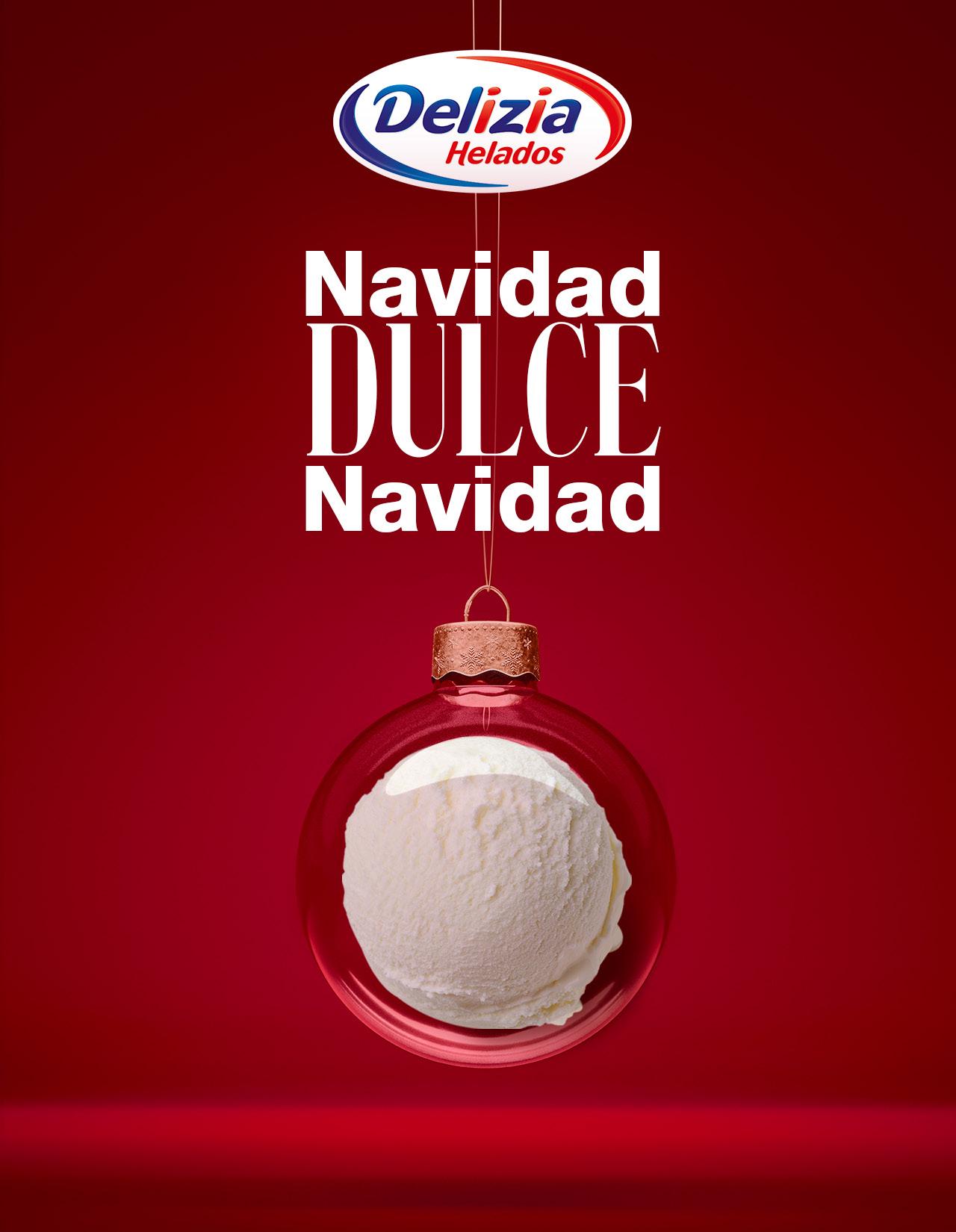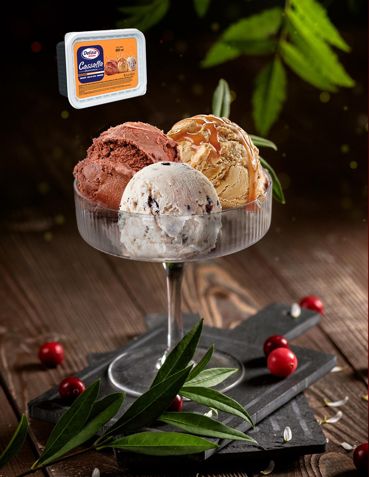 Helado de leche sabor panetón y sabor chocolate, con masa de panetón, fruta abrillantada, nibs de cacao y gelatinas de sabores (piña y frambuesa).