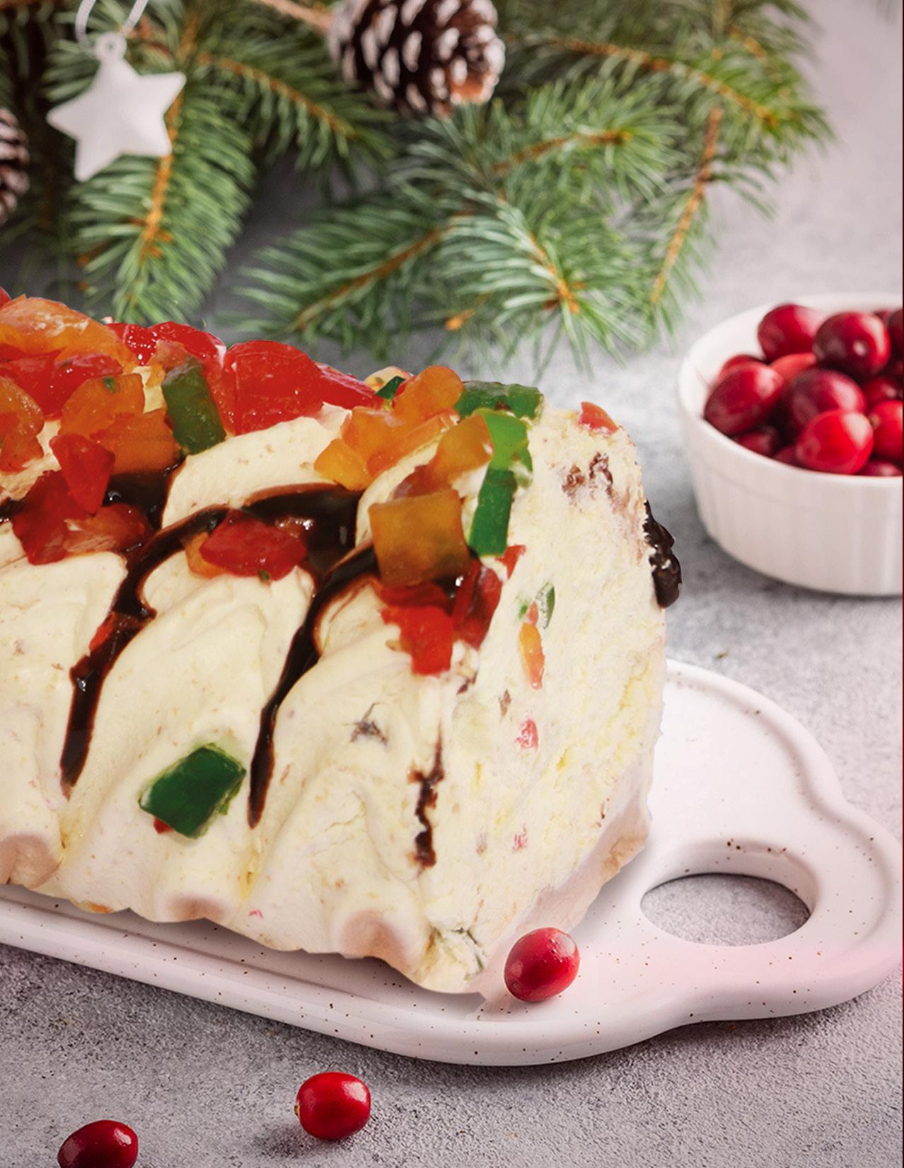 Helado de crema sabor panettone con masas de panettone, fruta abrillantada, trozos de almendra, uva pasa y gelatina de sabores (piña y frutos rojos)