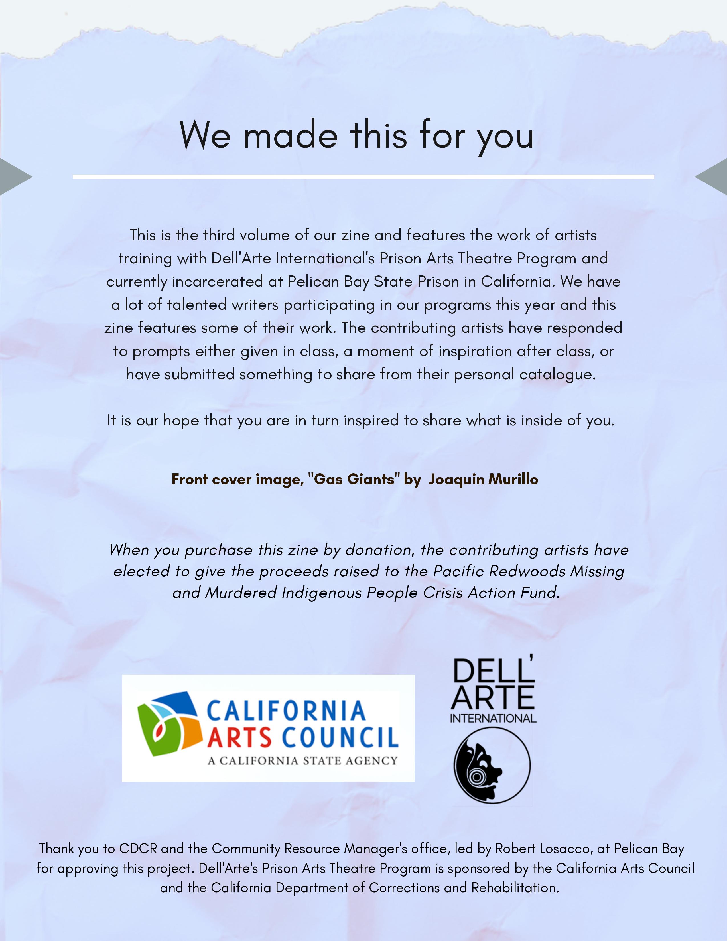 Created by participants in our Prison Theatre Arts Program. This zine was initially sold as a fundraiser for the Pacific Redwoods Missing and Murdered Indigenous Peoples Crisis Action Fund on behalf of artist contributors. We were able to raise close to $1000.00. Please enjoy!