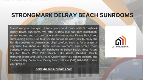 Transform your backyard into a year-round oasis with StrongMark Delray Beach Sunrooms. We offer professional sunroom installation, screen rooms, and custom patio enclosures across Delray Beach and surrounding areas. Our four season sunrooms allow you to enjoy the Florida sunshine in climate-controlled comfort. Looking for a seasonal upgrade? Ask about our three season sunrooms and screen room options. Proudly serving our neighbors in Delray Beach, Boca Raton, Boynton Beach, West Palm Beach, Lake Worth, Deerfield Beach, Highland Beach, and Gulf Stream. Quality materials, expert builders, and local reliability. Contact our Delray Beach office at (561) 407-6988 to start your project.