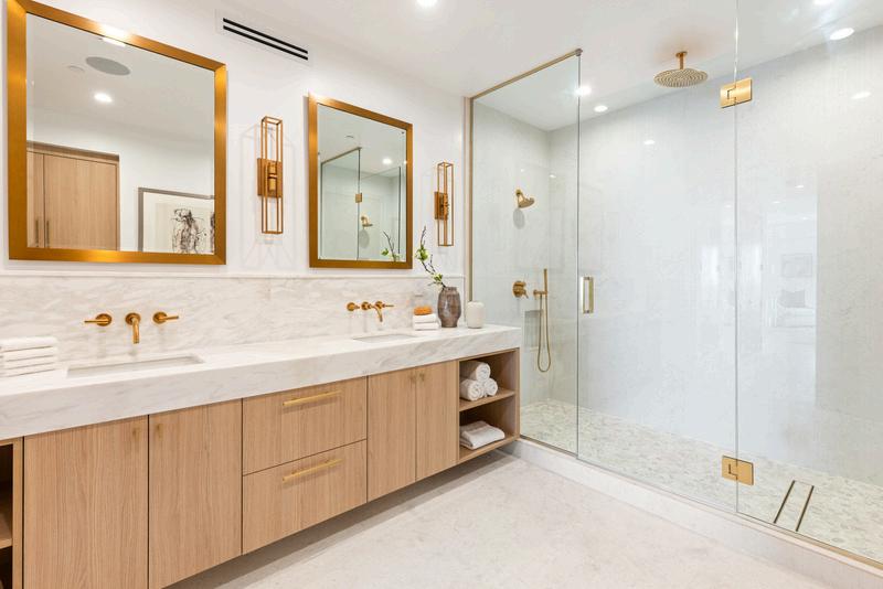Light-filled luxury defines this high-rise condo. Oak paneling, custom millwork, and gold hardware complement stunning marble A custom Oak media wall anchors the living area, surrounded by harmonious textures –boucle, wood, leather, and stone – creating a cozy, inviting home.
