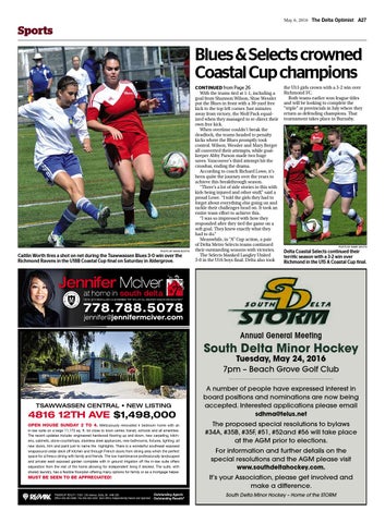 CONTINUED from Page 26 With the teams tied at 1-1, including a goal from Shannon Wilson, Shae Wessler put the Blues in front with a 30-yard free kick to the top left corner. Just minutes away from victory, the Wolf Pack equalized when they managed to re-direct their own free kick. When overtime couldn’t break the deadlock, the teams headed to penalty kicks where the Blues promptly took control. Wilson, Wessler and Mary Berger all converted their attempts, while goalkeeper Abby Parson made two huge saves. Vancouver’s third attempt hit the crossbar, ending the drama. According to coach Richard Lowe, it’s been quite the journey over the years to achieve this breakthrough season. “There’s a lot of side stories to this with kids being injured and other stuff,” said a proud Lowe. “I told the girls they had to forget about everything else going on and tackle their challenges head on. It took an entire team effort to achieve this. “I was so impressed with how they responded after they tied the game on a soft goal. They knew exactly what they had to do.” Meanwhile, in “A” Cup action, a pair of Delta Metro Selects teams continued their outstanding seasons with victories. The Selects blanked Langley United 3-0 in the U16 boys final. Delta also took