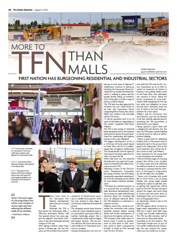 derway on both sides of Highway 17. Subdivisions continue to spring up, including the Tsawwassen Shores development by Aquilini Development, which is building in phases and has people already taking up residence. Onni Group plans to build a range of homes as well as Mosaic. The TFN land use plan approved by members has over 2,800 homes to be built with Tsawwassen Shores comprising 850 of those units. About 8,000 new residents will eventually call the TFN home. “It will be anywhere from 15 to 20 years to full build-out, depending on the market,” explained Chief Bryce Williams. The TFN is also seeing its industrial lands developed with a new business park aimed at easing the growing demand for warehousing and logistics centres in the Lower Mainland. The biggest development, so far, is a 23-hectare (57-acre) parcel leased to Great West Life for a 1.3-millionsquare-feet of logistics warehousing. The Canada Border Services Agency’s Tsawwassen Container Inspection Facility is to open this fall. When fully built out, the industrial developments are expected to generate an estimated $245 million in annual income for TFN. Following a review of the TFN Economic Development Corporation last spring, however, the First Nation temporarily suspended marketing efforts for the remaining section slated for port-related industrial development. “TFN lands are a limited resource, so it is essential that we carefully consider alternative development models to ensure we make well-informed decisions about the remaining 180 acres of unleased industrial lands,” the TFN declared in a statement issued last summer. Williams noted they would be consulting the community and various potential partners before moving ahead with further development to determine the highest and best use. TFN members have clearly been selective when it comes to development on their lands. In 2015, members voted to reject a proposal by FortisBC to build an LNG terminal near the ferry terminal.