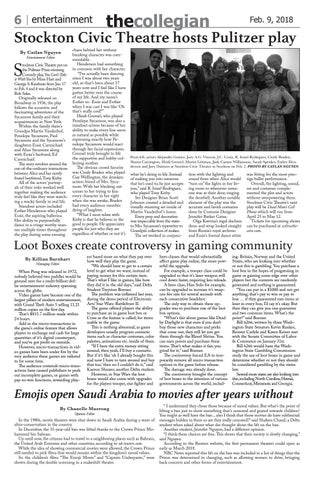 was fitting for the most prestige ballet performance. Overall, the lighting, sound, set and costumes complemented the plot and actors without overpowering them. Stockton Civic Theatre’s next play will be Dead Man’s Cell Phone which will run from April 25 to May 12. Tickets for upcoming shows can be purchased at sctlivetheatre.com.