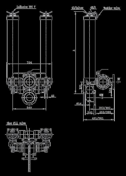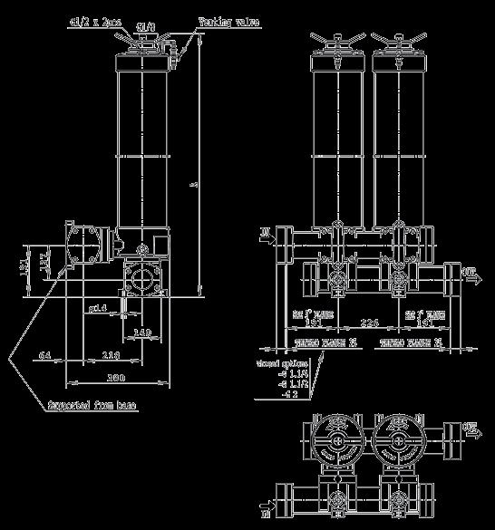Leitungsfilter als Einzelfilter, Doppeleinheit, Paralleleinheit oder Filtersystem mit L-Bohrung zur Auswahl des Ventilseinbaus (nur eine Seite wird verwendet). Vertikaler Einbau
