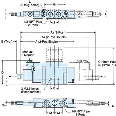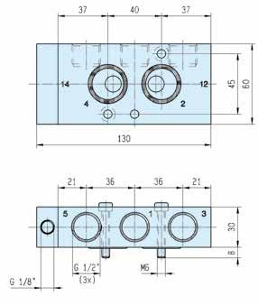 Symbol Größe Betätigung Mindestbetriebsdruck (bar) Umschaltzeit (ms) bei 6 bar und 20 °C Betät./ Rückstellung Gewicht Kg Artikelnummer ohne Spule Artikelnummer 24 VDC (22 mm Spule) G1/8 Elektrisch/ elektrisch Selbstzentrierend, geschlossene Mittelstellung 3,0 18/40 0,26 P2LAZ611EENDCN P2LAZ611EENDCB49 G1/4 3,0 22/55 0,28 P2LBZ612EENDCN P2LBZ612EENDCB49 G3/8 3,0 30/90 0,60 P2LCZ613EENDCN P2LCZ613EENDCB49 G1/8 Elektrisch/ elektrisch Selbstzentrierend, druckbeaufschlagte Mittelstellung 3,0 18/40 0,26 P2LAZ711EENDCN P2LAZ711EENDCB49 G1/4 3,0 22/45 0,28 P2LBZ712EENDCN P2LBZ712EENDCB49 G3/8 3,0 30/90 0,60 P2LCZ713EENDCN P2LCZ713EENDCB49 G1/8 Elektrisch/ elektrisch Selbstzentrierend, entlüftete Mittelstellung 3,0 18/40 0,26 P2LAZ811EENDCN P2LAZ811EENDCB49 G1/4 3,0 22/45 0,28 P2LBZ812EENDCN P2LBZ812EENDCB49 G3/8 3,0 30/90 0,60 P2LCZ813EENDCN P2LCZ813EENDCB49