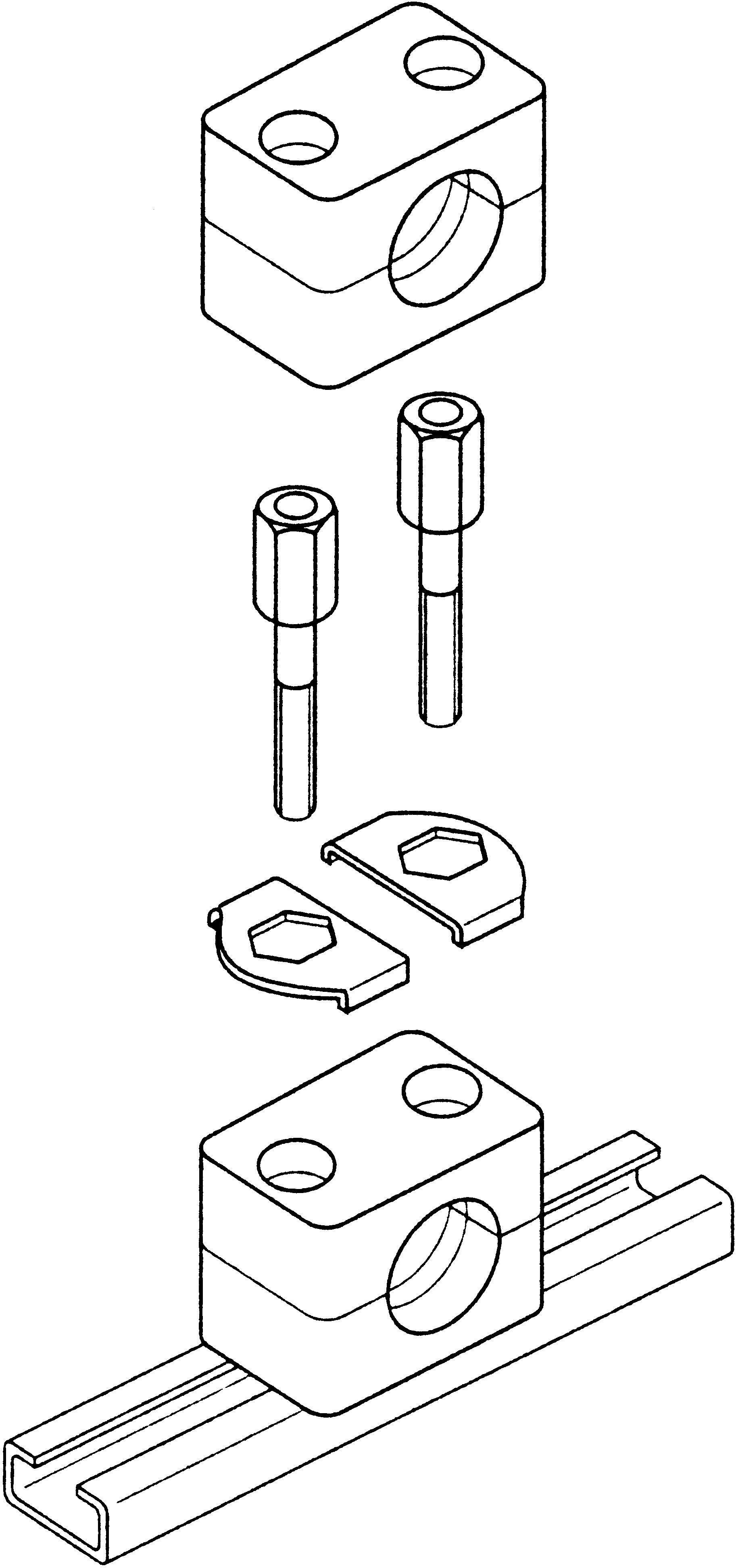 2 clamp halves, rail nuts, cover plate, hex. head bolts
