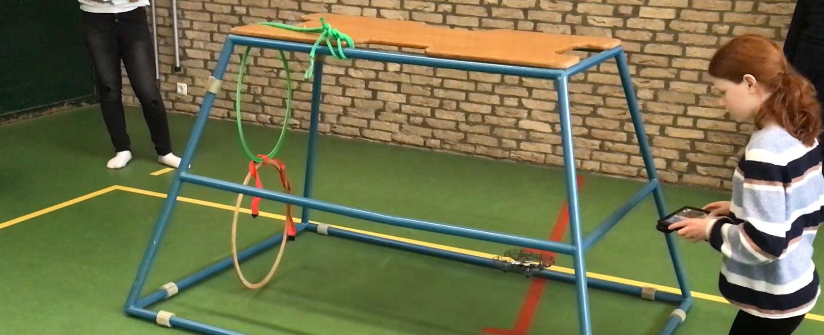 In groepjes gingen we bijna elke dag vliegen. Je kreeg per groepje twee accu’s en daarmee kon je in totaal 16 minuten vliegen. We moesten ons parcours uittekenen op papier en daarna moesten we in de gymzaal het parcours uitzetten en oefenen. We hebben een aantal keren ons eigen parcours onderdeel geoefend en mochten die van de andere groepjes niet oefenen.